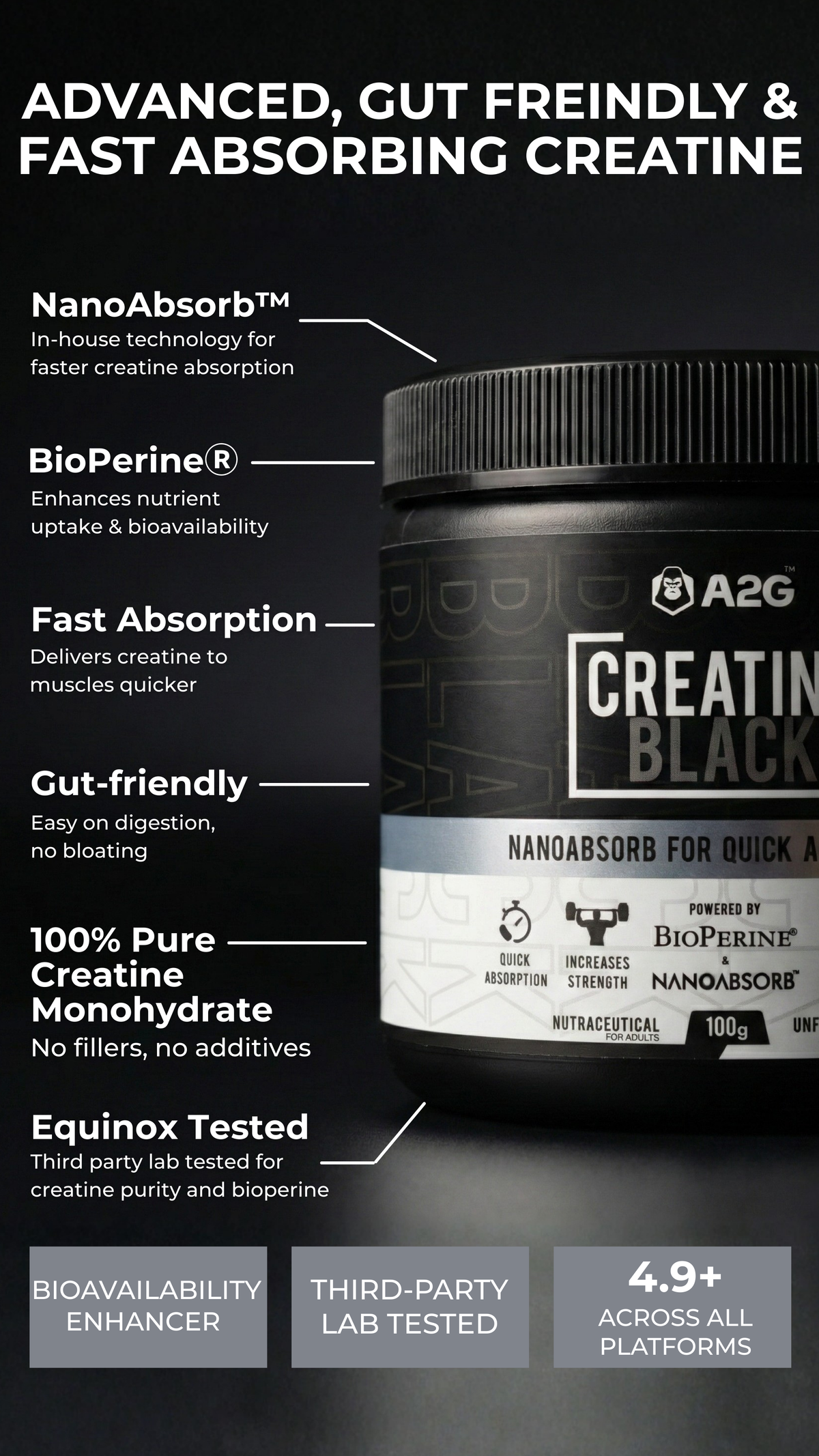 A2G Creatine Black is engineered for athletes who demand rapid gains. It combines pure creatine monohydrate with BioPerine® and NanoAbsorb™ technology for faster uptake and maximal strength and recovery